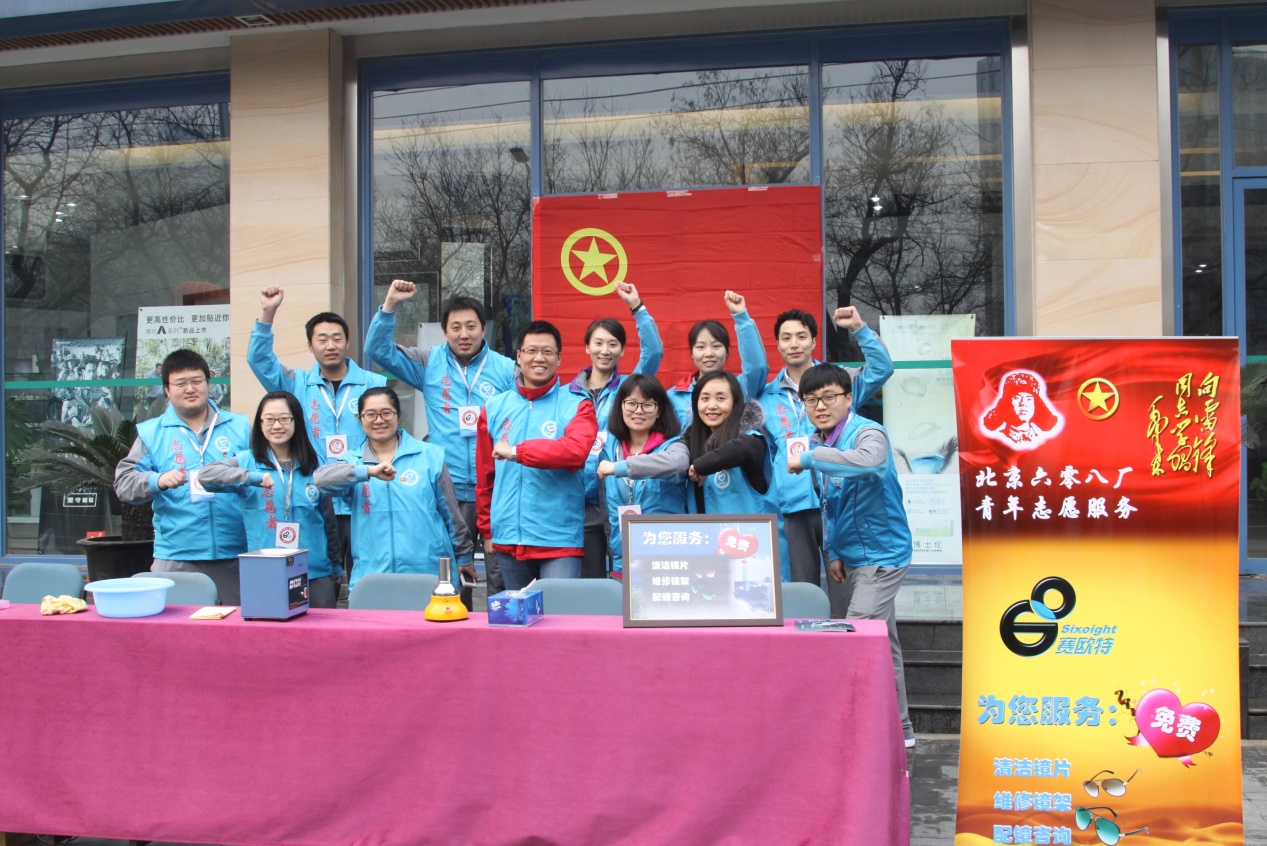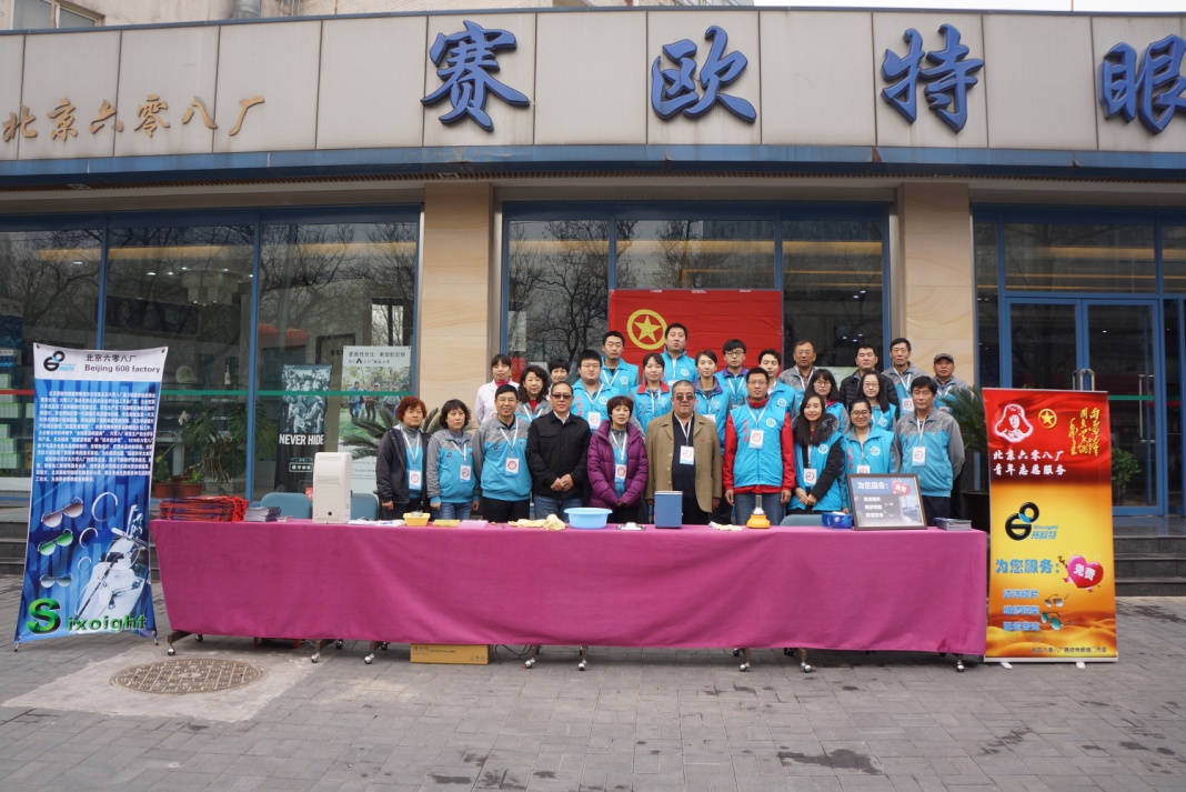 在毛澤東同志提出“向雷鋒同志學(xué)習(xí)”53周年之際,3月5日北京六零八廠團(tuán)支部及賽歐特眼鏡門市部的全體技師,在《學(xué)習(xí)雷鋒好榜樣》、《年輕的朋友來相會(huì)》歌聲中,投入到“學(xué)雷鋒,我奉獻(xiàn),我快樂的志愿服務(wù)中來”,期間,一輕團(tuán)委書記姚鶴鵬、北京玻璃集團(tuán)公司團(tuán)委副書記管文祺、北京六零八廠黨支部書記張希雨及廠領(lǐng)導(dǎo)班子一起參與志愿服務(wù)。為百姓免費(fèi)眼睛驗(yàn)光、眼鏡清洗、眼鏡修理、眼鏡更換鼻托等。青年團(tuán)員及各科室、鍋爐配電室?guī)煾祩円才宕髦驹刚咝嘏茀⑴c廠區(qū)清潔志愿勞動(dòng)中,幾個(gè)小時(shí)后,被洗刷后魚池的圍欄和被擦拭的燈桿、被清理的下水道口等,猶如嶄新般。此次活動(dòng)增強(qiáng)了青年團(tuán)員奉獻(xiàn)、團(tuán)結(jié)精神。打造和宣傳了賽歐特品牌,彰顯了國(guó)有企業(yè)服務(wù)社會(huì)、服務(wù)百姓之宗旨。
